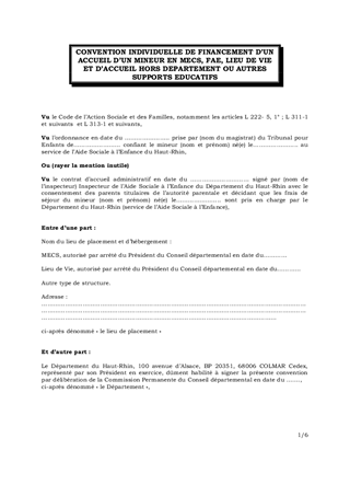CONVENTION INDIVIDUELLE DE FINANCEMENT D'UN MINEUR EN MECS, FAE, LIEU DE VIE ET D'ACCUEIL HORS DEPARTEMENT ET AUTRES SUPPORTS EDUCATIFS