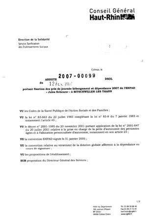 portant fixation des prix de journée hébergement et dépendance 2007 de l'EHPAD "Jules Scheurer" à BITSCHWILLER LES THANN. Resumé Pièces jointes ARRETE Assemblée : Non défini Date : 12/02/2007 Rapporteur : Non défini Collectivité : Conseil départemental du Haut-Rhin Direction : Non défini Service : Service de la Tarification des Etablissements Domaine : Prix de Journée Commission :