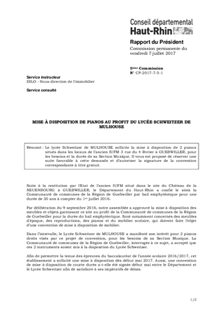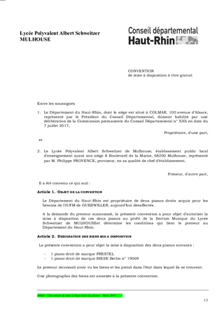 Le lycée Schweitzer de MULHOUSE sollicite la mise à disposition de 2 pianos situés dans les locaux de l’ancien IUFM 3 rue du 4 février à GUEBWILLER, pour les besoins et la durée de sa Section Musique. Il vous est proposé de réserver une suite favorable à cette demande et d’autoriser la signature de la convention correspondante à titre gratuit.
