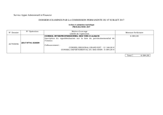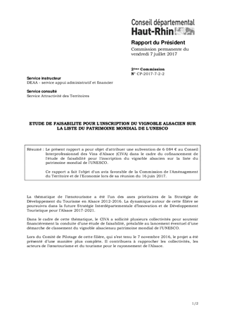 Le présent rapport a pour objet d'attribuer une subvention de 6 084 € au Conseil Interprofessionnel des Vins d'Alsace (CIVA) dans le cadre du cofinancement de l'étude de faisabilité pour l'inscription du vignoble alsacien sur la liste du patrimoine mondial de l'UNESCO. Ce rapport a fait l'objet d'un avis favorable de la Commission de l'Aménagement du Territoire et de l'Economie lors de sa réunion du 16 juin 2017.