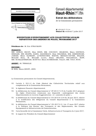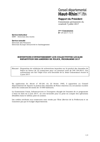SUBVENTIONS D'INVESTISSEMENT AUX COLLECTIVITES LOCALES REPARTITION DES AMENDES DE POLICE, PROGRAMME 2017