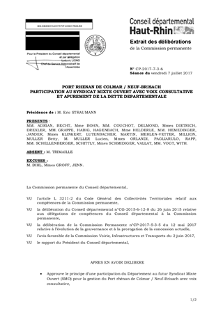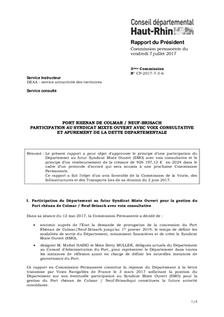 PORT RHENAN DE COLMAR / NEUF-BRISACH PARTICIPATION AU SYNDICAT MIXTE OUVERT AVEC VOIX CONSULTATIVE ET APUREMENT DE LA DETTE DEPARTEMENTALE