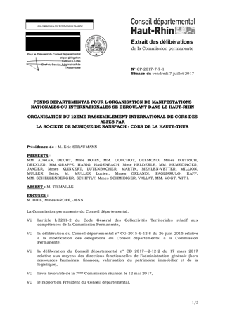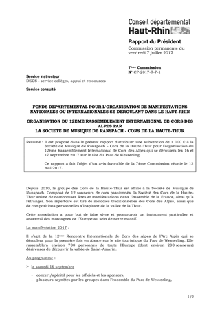 Il est proposé dans le présent rapport d'attribuer une subvention de 1 000 € à la Société de Musique de Ranspach - Cors de la Haute-Thur pour l’organisation du 12ème Rassemblement International de Cors des Alpes qui se déroulera les 16 et 17 septembre 2017 sur le site du Parc de Wesserling. Ce rapport a fait l’objet d’un avis favorable de la 7ème Commission réunie le 12 mai 2017.