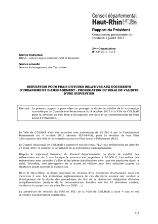 Le présent rapport a pour objet de proroger la durée de validité de la subvention accordée par la Commission Permanente du 4 octobre 2013 à la Ville de COLMAR pour la révision de son Plan d'Occupation des Sols et sa transformation en Plan Local d'Urbanisme.