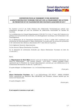 Le présent rapport a pour objet : - d'attribuer à Alsace Destination Tourisme (ADT) un montant de 15 000 € pour les actions de promotion et de valorisation des châteaux alsaciens qu'elle conduit en sa qualité de chef de file de la filière "châteaux", - d'approuver la convention de financement à intervenir entre ADT et le Département et d'autoriser le Président à la signer. Ce rapport a fait l'objet d'un avis favorable de la Commission de l'Aménagement du Territoire et de l'Economie lors de sa réunion en date du 16 juin 2017.