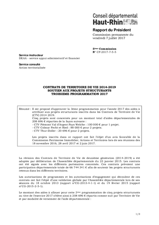 Il est proposé d’approuver la 3ème programmation pour l’année 2017 des aides à attribuer aux projets structurants inscrits dans les Contrats de Territoire de Vie (CTV) 2014 2019. Cinq projets sont concernés pour un montant total d’aides départementales de 208 696 € réparties de la façon suivante : - CTV Piémont Val d’Argent Pays Welche : 100 000 € pour 1 projet. - CTV Colmar Fecht et Ried : 88 000 € pour 2 projets. - CTV Thur-Doller : 20 696 € pour 2 projets. Les projets inscrits dans ce rapport ont fait l’objet d’un avis favorable de la Commission Patrimoine Immobilier, Actions et Territoires lors de ses réunions des 18 novembre 2016, 28 avril 2017 et 2 juin 2017.