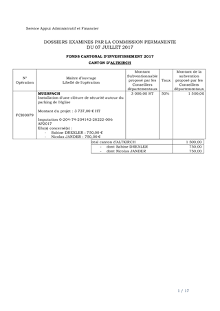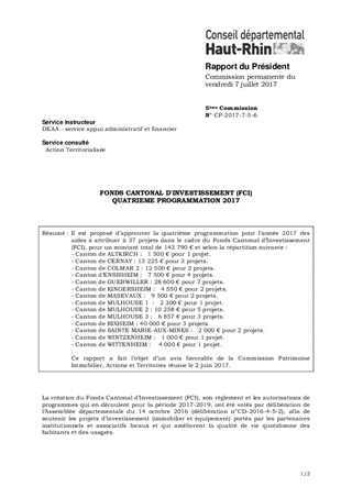 Il est proposé d’approuver la quatrième programmation pour l’année 2017 des aides à attribuer à 37 projets dans le cadre du Fonds Cantonal d’Investissement (FCI), pour un montant total de 143 790 € et selon la répartition suivante : - Canton de ALTKIRCH : 1 500 € pour 1 projet. - Canton de CERNAY : 13 225 € pour 3 projets. - Canton de COLMAR 2 : 12 500 € pour 2 projets. - Canton d’ENSISHEIM : 7 500 € pour 4 projets. - Canton de GUEBWILLER : 28 600 € pour 7 projets. - Canton de KINGERSHEIM : 4 550 € pour 2 projets. - Canton de MASEVAUX : 9 500 € pour 2 projets. - Canton de MULHOUSE 1 : 2 300 € pour 1 projet. - Canton de MULHOUSE 2 : 10 258 € pour 5 projets. - Canton de MULHOUSE 3 : 6 857 € pour 3 projets. - Canton de RIXHEIM : 40 000 € pour 3 projets. - Canton de SAINTE MARIE-AUX-MINES : 2 000 € pour 2 projets. - Canton de WINTZENHEIM : 1 000 € pour 1 projet. - Canton de WITTENHEIM : 4 000 € pour 1 projet. Ce rapport a fait l’objet d’un avis favorable de la Commission Patrimoine Immobilier, Actions et Territoires réunie le 2 juin 2017.