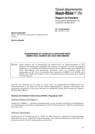 Après examen par la Commission de l'Agriculture, de l'Environnement et du Cadre de Vie des dossiers présentés les 24 mars et 5 mai 2017, il vous est proposé d'affecter sur la Dotation de Solidarité Urbain-Rural (DSUR), gérée par l'Agence de l'Eau Rhin-Meuse, les opérations suivantes, pour un montant total de subventions de 96 773 €, au bénéfice des communes d'ORBEY et de KIFFIS, du SIAEP de la Vallée de la Doller et de la Communauté de Communes de la Vallée de Saint-Amarin.