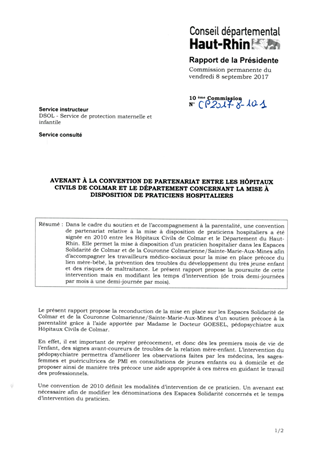 Dans le cadre du soutien et de l’accompagnement à la parentalité, une convention de partenariat relative à la mise à disposition de praticiens hospitaliers a été signée en 2010 entre les Hôpitaux Civils de Colmar et le Département du Haut-Rhin. Elle permet la mise à disposition d’un praticien hospitalier dans les Espaces Solidarité de Colmar et de la Couronne Colmarienne/Sainte-Marie-Aux-Mines afin d’accompagner les travailleurs médico-sociaux pour la mise en place précoce du lien mère-bébé, la prévention des troubles du développement du très jeune enfant et des risques de maltraitance. Le présent rapport propose la poursuite de cette intervention mais en modifiant les temps d’intervention (de trois demi-journées par mois à une demi-journée par mois).