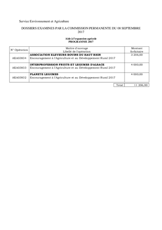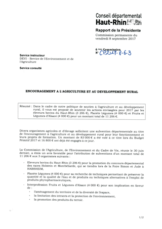 Dans le cadre de notre politique de soutien à l’agriculture et au développement rural, il vous est proposé de soutenir les actions envisagées pour 2017 par les éleveurs bovins du Haut-Rhin (3 206 €), Planète Légumes (4 000 €) et Fruits et Légumes d’Alsace (4 000 €) pour un montant total de 11 206 €.