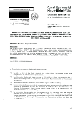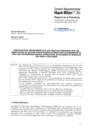 PARTICIPATION DÉPARTEMENTALE AUX TRAVAUX PRESCRITS SUR LES HABITATIONS DE QUATRE PARTICULIERS SITUÉES DANS LE PÉRIMÈTRE DU PPRT DES ENTREPRISES RHODIA-OPÉRATIONS, BUTACHIMIE ET BOREALIS PEC-RHIN A CHALAMPÉ