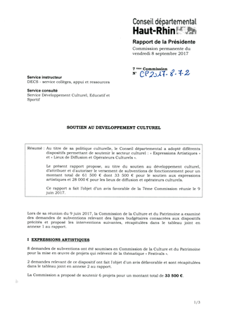 Au titre de sa politique culturelle, le Conseil départemental a adopté différents dispositifs permettant de soutenir le secteur culturel : « Expressions Artistiques » et « Lieux de Diffusion et Opérateurs Culturels ». Le présent rapport propose, au titre du soutien au développement culturel, d’attribuer et d'autoriser le versement de subventions de fonctionnement pour un montant total de 61 500 € dont 33 500 € pour le soutien aux expressions artistiques et 28 000 € pour les lieux de diffusion et opérateurs culturels. Ce rapport a fait l’objet d’un avis favorable de la 7ème Commission réunie le 9 juin 2017.