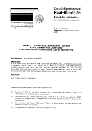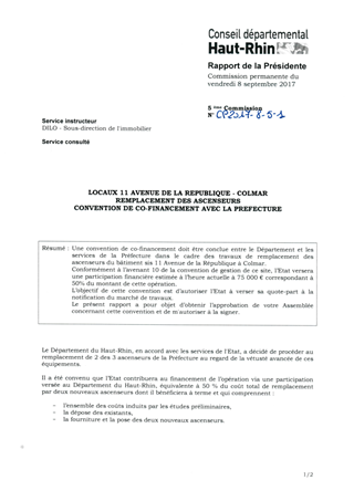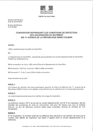 LOCAUX 11 AVENUE DE LA REPUBLIQUE - COLMARREMPLACEMENT DES ASCENSEURSCONVENTION DE CO-FINANCEMENT AVEC LA PREFECTURE