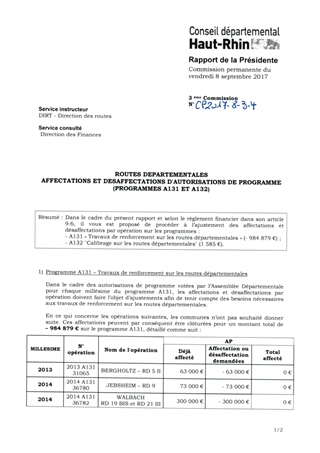 Dans le cadre du présent rapport et selon le règlement financier dans son article 9.6, il vous est proposé de procéder à l’ajustement des affectations et désaffectations par opération sur les programmes : - A131 « Travaux de renforcement sur les routes départementales » (- 984 879 €) ; - A132 "Calibrage sur les routes départementales" (1 585 €).
