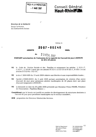 portant autorisation de l'extension de la capacité de l'accueil de jour à SOULTZ de 20 à 25 places. Resumé Pièces jointes ARRETE Assemblée : Non défini Date : 23/02/2007 Rapporteur : Non défini Collectivité : Conseil départemental du Haut-Rhin Direction : Non défini Service : Service de la Tarification des Etablissements Domaine : Autres (non classés) Commission :