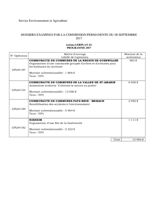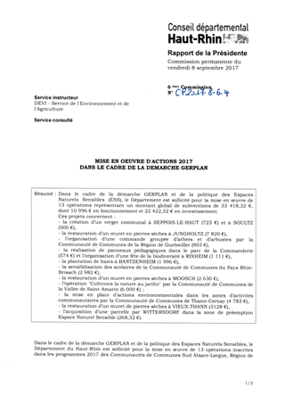 Dans le cadre de la démarche GERPLAN et de la politique des Espaces Naturels Sensibles (ENS), le Département est sollicité pour la mise en œuvre de 13 opérations représentant un montant global de subventions de 33 418,32 €, dont 10 996 € en fonctionnement et 22 422,32 € en investissement. Ces projets concernent : - la création d’un verger communal à SEPPOIS-LE-HAUT (723 €) et à SOULTZ (500 €), - la restauration d’un muret en pierres sèches à JUNGHOLTZ (7 820 €), - l’organisation d’une commande groupée d’arbres et d’arbustes par la Communauté de Communes de la Région de Guebwiller (903 €), - la réalisation de panneaux pédagogiques dans le parc de la Commanderie (574 €) et l’organisation d’une fête de la biodiversité à RIXHEIM (1 111 €), - la plantation de haies à BANTZENHEIM (1 996 €), - la sensibilisation des scolaires de la Communauté de Communes du Pays Rhin-Brisach (2 982 €), - la restauration d’un muret en pierres sèches à MOOSCH (2 630 €), - l’opération "Cultivons la nature au jardin" par la Communauté de Communes de la Vallée de Saint-Amarin (6 000 €) ; - la mise en place d’actions environnementales dans les zones d’activités communautaires par la Communauté de Communes de Thann-Cernay (4 783 €), - la restauration d’un muret de pierres sèches à VIEUX-THANN (3128 €), - l’acquisition d’une parcelle par WITTERSDORF dans la zone de préemption Espace Naturel Sensible (268,32 €).