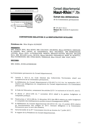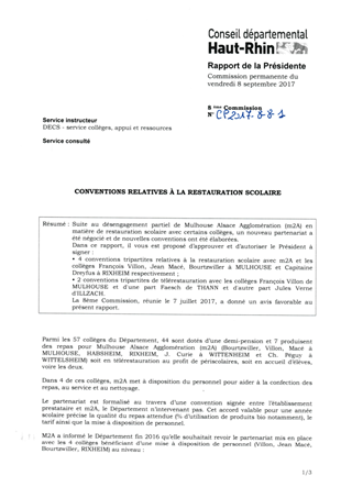 Suite au désengagement partiel de Mulhouse Alsace Agglomération (m2A) en matière de restauration scolaire avec certains collèges, un nouveau partenariat a été négocié et de nouvelles conventions ont été élaborées. Dans ce rapport, il vous est proposé d’approuver et d’autoriser le Président à signer : • 4 conventions tripartites relatives à la restauration scolaire avec m2A et les collèges François Villon, Jean Macé, Bourtzwiller à MULHOUSE et Capitaine Dreyfus à RIXHEIM respectivement ; • 2 conventions tripartites de télérestauration avec les collèges François Villon de MULHOUSE et d'une part Faesch de THANN et d'autre part Jules Verne d'ILLZACH. La 8ème Commission, réunie le 7 juillet 2017, a donné un avis favorable au présent rapport.
