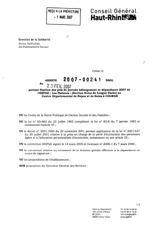 portant fixation des prix de journée hébergement et dépendance 2007 de l'EHPAD "Les Platanes" (section soins de longue durée) au centre départemental de repos et de soins à COLMAR. Resumé Pièces jointes ARRETE Assemblée : Non défini Date : 23/02/2007 Rapporteur : Non défini Collectivité : Conseil départemental du Haut-Rhin Direction : Non défini Service : Service de la Tarification des Etablissements Domaine : Prix de Journée Commission :