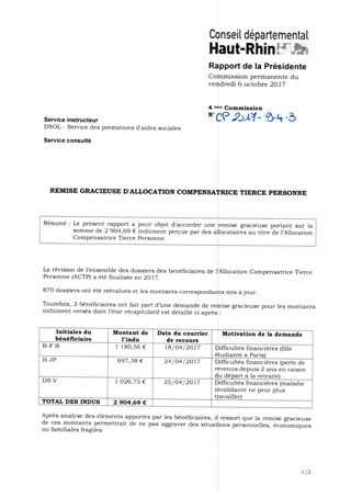 Le présent rapport a pour objet d'accorder une remise gracieuse portant sur la somme de 2 904,69 € indûment perçue par des allocataires au titre de l’Allocation Compensatrice Tierce Personne.