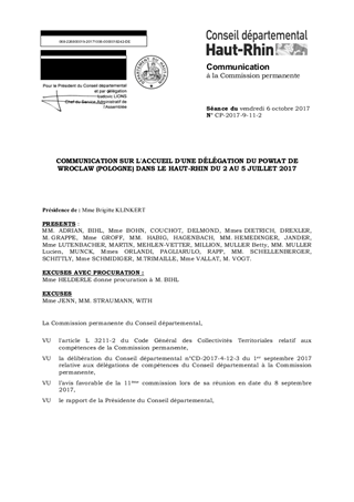 COMMUNICATION SUR L'ACCUEIL D'UNE DÉLÉGATION DU POWIAT DE WROCLAW (POLOGNE) DANS LE HAUT-RHIN DU 2 AU 5 JUILLET 2017