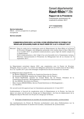 Dans le cadre de la coopération entre le Département du Haut-Rhin et le Powiat de Wroclaw (Pologne), une délégation polonaise s’est rendue dans le Haut-Rhin du 2 au 5 juillet 2017. La présente communication a pour objet de rendre compte de ce déplacement. Cette communication a fait l'objet d'un avis favorable de la Commission Actions, Relations Internationales et Promotion du Bilinguisme lors de sa réunion du 8 septembre 2017.