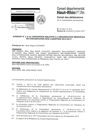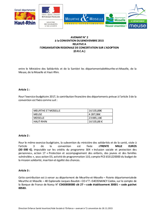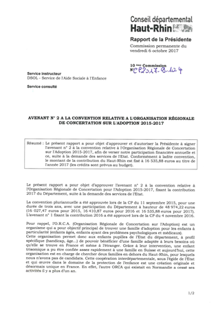 Le présent rapport a pour objet d'approuver et d'autoriser la Présidente à signer l'avenant n° 2 à la convention relative à l'Organisation Régionale de Concertation sur l'Adoption 2015-2017, afin de verser notre participation financière annuelle et ce, suite à la demande des services de l'Etat. Conformément à ladite convention, le montant de la contribution du Haut-Rhin est fixé à 16 535,88 euros au titre de l'année 2017 (les crédits sont prévus au budget).