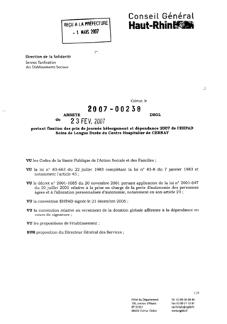 portant fixation des prix de journée hébergement et dépendance 2007 de l'EHPAD - Soins de longue durée du centre hospitalier de CERNAY. Resumé Pièces jointes ARRETE Assemblée : Non défini Date : 23/02/2007 Rapporteur : Non défini Collectivité : Conseil départemental du Haut-Rhin Direction : Non défini Service : Service de la Tarification des Etablissements Domaine : Prix de Journée Commission :