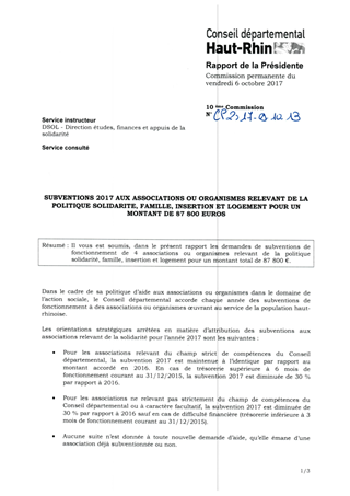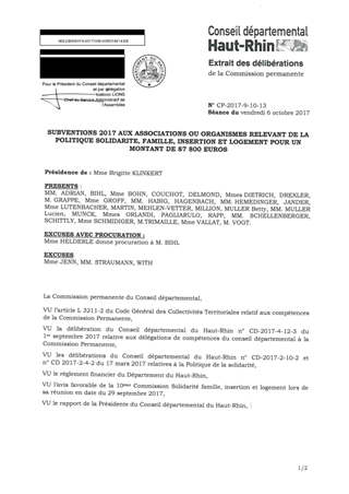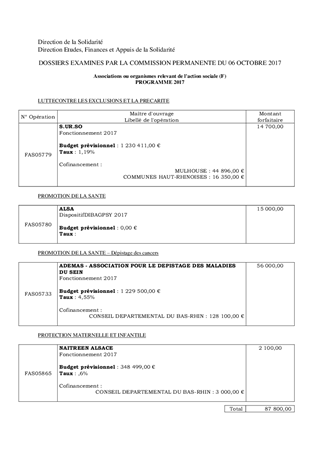 SUBVENTIONS 2017 AUX ASSOCIATIONS OU ORGANISMES RELEVANT DE LA POLITIQUE SOLIDARITE, FAMILLE, INSERTION ET LOGEMENT POUR UN MONTANT DE 87 800 EUROS