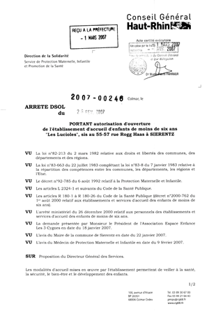 portant autorisation d'ouverture de l'établissement d'accueil d'enfants de moins de six ans "Les Lucioles", sis au 55-57 rue Rogg Haas à SIERENTZ. Resumé Pièces jointes ARRETE Assemblée : Non défini Date : 26/02/2007 Rapporteur : Non défini Collectivité : Conseil départemental du Haut-Rhin Direction : Non défini Service : Service de Protection Maternelle et Infantile Domaine : Accueil d'enfants Commission :