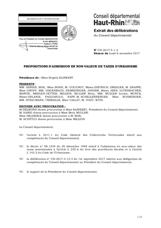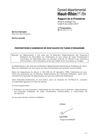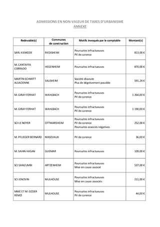 Le Département a été saisi par le Directeur Départemental des Finances Publiques du Haut-Rhin sur l’admission en non valeur de taxes d’urbanisme concernant 23 redevables pour un montant total de 30 786,24 € qui s’avèrent irrécouvrables. Cette admission ne fait pas l’objet d’une inscription au budget.