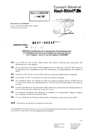 portant modification de l'autorisation de fonctionnement de l'établissement d'accueil d'enfants de moins de six ans 'Les 3 Cygnes", sis au 3 rue des Cygnes à LANDSER. Resumé Pièces jointes ARRETE Assemblée : Non défini Date : 26/02/2007 Rapporteur : Non défini Collectivité : Conseil départemental du Haut-Rhin Direction : Non défini Service : Service de Protection Maternelle et Infantile Domaine : Accueil d'enfants Commission :