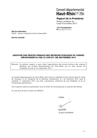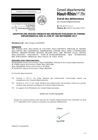 Le présent rapport a pour objet l'approbation des procès-verbaux des séances plénières du Conseil départemental du Haut-Rhin qui se sont tenues les vendredis 23 juin et 1er septembre 2017.