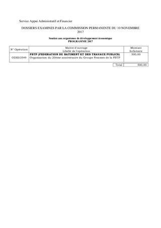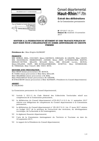 Dans le cadre du présent rapport, il est proposé d'accorder une subvention d'un montant de 500 € à la Fédération du Bâtiment et des Travaux Publics du Haut-Rhin pour l'organisation du 20ème anniversaire du Groupe Femmes. Ce rapport a fait l'objet d'un avis favorable de la Commission Aménagement du Territoire et Tourisme en date du 22 septembre 2017.