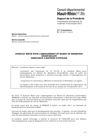 Le présent rapport a pour objet : -d'attribuer une subvention de 12 451,50 € au Syndicat Mixte pour l'aménagement du Massif du Markstein Grand-Ballon dans le cadre du financement d'une assistance à maîtrise d'ouvrage relative à l'aménagement du site du Markstein, - d'approuver la convention y afférente et d'autoriser la Présidente à la signer. Ce rapport a fait l'objet d'un avis favorable de la Commission de l'Agriculture, de l'Environnement et du Cadre de Vie lors de sa réunion du 15 septembre 2017.