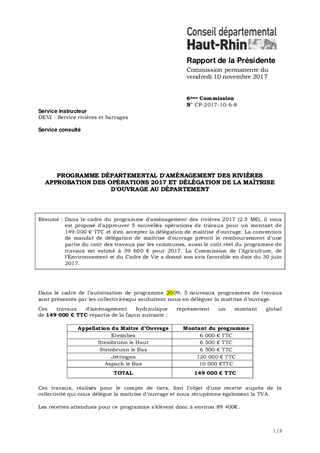 PROGRAMME DÉPARTEMENTAL D'AMÉNAGEMENT DES RIVIÈRES APPROBATION DES OPÉRATIONS 2017 ET DÉLÉGATION DE LA MAÎTRISE D'OUVRAGE AU DÉPARTEMENT