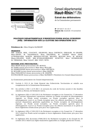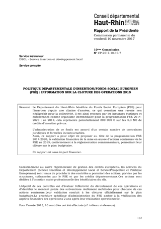Le Département du Haut-Rhin bénéficie du Fonds Social Européen (FSE) pour l'insertion depuis une dizaine d'années, ce qui constitue une recette non négligeable pour la collectivité. Il est ainsi reconnu par les instances étatiques et européennes comme organisme intermédiaire pour la programmation FSE 2014-2020 ; en 2017, cela représente potentiellement 800 000 € sur les 5,3 M€ de crédits d'insertion prévus. L'administration de ce fonds est assorti d'un certain nombre de contraintes juridiques et formelles incontournables. Ainsi, ce rapport a pour objet de proposer au titre de la programmation FSE 2014-2020, la validation financière de la mise en œuvre d’actions soutenues via le FSE en 2015, conformément à la réglementation communautaire, permettant leur clôture sur le plan budgétaire. Ce rapport est sans impact financier.