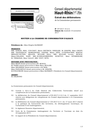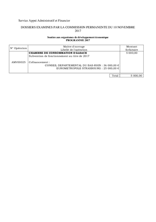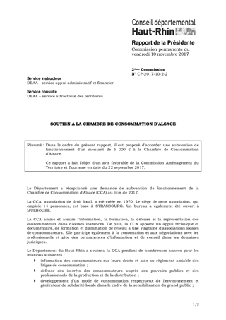 Dans le cadre du présent rapport, il est proposé d'accorder une subvention de fonctionnement d'un montant de 5 000 € à la Chambre de Consommation d'Alsace. Ce rapport a fait l'objet d'un avis favorable de la Commission Aménagement du Territoire et Tourisme en date du 22 septembre 2017.
