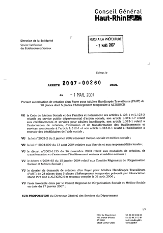 portant autorisation de création d'un foyer pour adultes handicapés travailleurs (FAHT) de 28 places dont 5 places d'hébergement temporaire à ALTKIRCH. Resumé Pièces jointes ARRETE Assemblée : Non défini Date : 01/03/2007 Rapporteur : Non défini Collectivité : Conseil départemental du Haut-Rhin Direction : Non défini Service : Service de la Tarification des Etablissements Domaine : Autres (non classés) Commission :