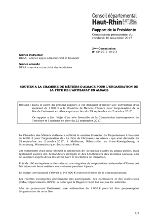 Dans le cadre du présent rapport, il est demandé d'allouer une subvention d'un montant de 1 000 € à la Chambre de Métiers d'Alsace pour l'organisation de la fête de l'artisanat en Alsace qui a eu lieu du 29 septembre au 2 octobre 2017. Ce rapport a fait l'objet d'un avis favorable de la Commission Aménagement du Territoire et Tourisme en date du 22 septembre 2017.
