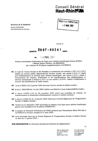 portant autorisation d'extension du foyer pour adultes handicapés graves (FAHG) "maison Sainte-Thérèse" de RIESPACH par création de 20 places supplémentaires à ALTKIRCH. Resumé Pièces jointes ARRETE Assemblée : Non défini Date : 01/03/2007 Rapporteur : Non défini Collectivité : Conseil départemental du Haut-Rhin Direction : Non défini Service : Service de la Tarification des Etablissements Domaine : Autres (non classés) Commission :