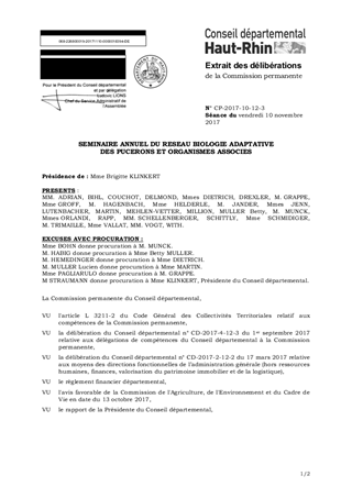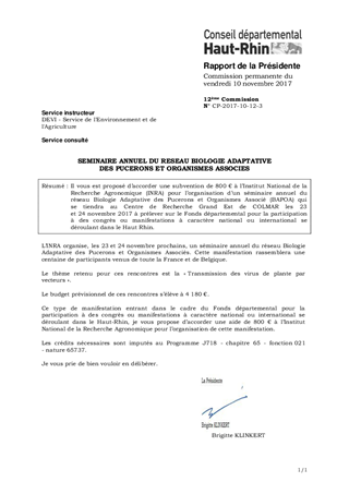Il vous est proposé d’accorder une subvention de 800 € à l’Institut National de la Recherche Agronomique (INRA) pour l’organisation d’un séminaire annuel du réseau Biologie Adaptative des Pucerons et Organismes Associé (BAPOA) qui se tiendra au Centre de Recherche Grand Est de COLMAR les 23 et 24 novembre 2017 à prélever sur le Fonds départemental pour la participation à des congrès ou manifestations à caractère national ou international se déroulant dans le Haut Rhin.
