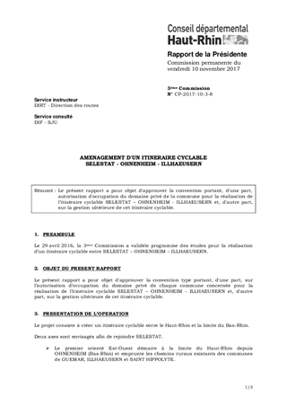 Le présent rapport a pour objet d'approuver la convention portant, d'une part, autorisation d'occupation du domaine privé de la commune pour la réalisation de l’itinéraire cyclable SELESTAT – OHNENHEIM - ILLHAEUSERN et, d'autre part, sur la gestion ultérieure de cet itinéraire cyclable.