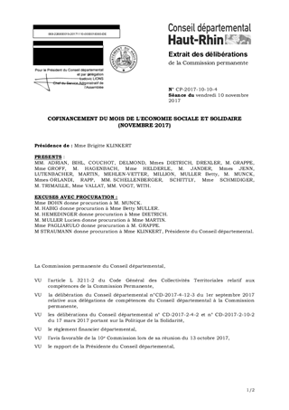 La Chambre Régionale de l’Economie Sociale et Solidaire (CRESS) Grand Est organise, en novembre 2017, le Mois de l’Economie Sociale et Solidaire. Pour la première fois, le périmètre de cette organisation sera le Grand Est. 200 évènements (conférences, portes ouvertes, projections-débats, etc.) seront organisés sur l'ensemble du territoire, dont le Haut-Rhin. L’Economie Sociale et Solidaire est un acteur économique essentiel du champ de la Solidarité, de par ses missions en faveur de l’enfance, de l'insertion, des personnes âgées et des personnes en situation de handicap. Il est proposé d'autoriser le cofinancement du Mois de l’Economie Sociale et Solidaire à hauteur de 2 000 € (à l'instar de 2016).