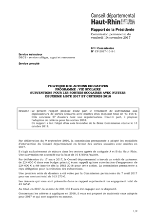 Le présent rapport propose d’une part le versement de subventions aux organisateurs de sorties scolaires avec nuitées d’un montant total de 43 165 €. Cela concerne 27 dossiers dont une régularisation. D’autre part, il propose l’adoption de critères pour les sorties 2018. Ce rapport a fait l’objet d’un avis favorable de la 8ème Commission réunie le 13 octobre 2017.