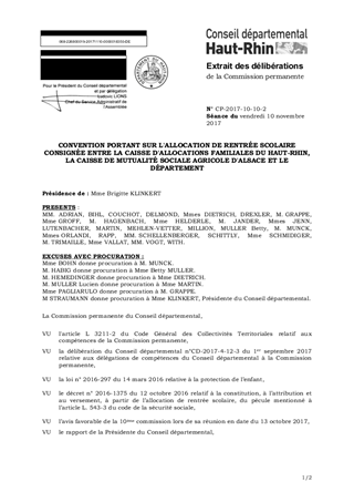 CONVENTION PORTANT SUR L'ALLOCATION DE RENTRÉE SCOLAIRE CONSIGNÉE ENTRE LA CAISSE D'ALLOCATIONS FAMILIALES DU HAUT-RHIN, LA CAISSE DE MUTUALITÉ SOCIALE AGRICOLE D'ALSACE ET LE DÉPARTEMENT
