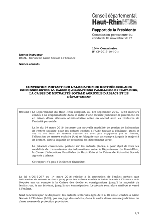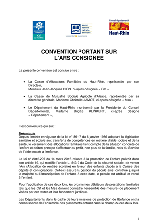Le Département du Haut-Rhin comptait, au 1er septembre 2017, 1732 mineurs confiés à sa responsabilité dans le cadre d’une mesure judiciaire de placement ou en raison d’une décision administrative actée en accord avec les titulaires de l’autorité parentale. La loi du 14 mars 2016 instaure une nouvelle modalité de gestion de l'allocation de rentrée scolaire pour les enfants confiés à l’Aide Sociale à l’Enfance. Dans le cas où les frais de rentrée scolaire ne sont pas supportés par la famille, l'allocation de rentrée scolaire (Ars) est bloquée sur un compte jusqu'à la majorité de l'enfant, date à laquelle ce pécule lui est directement versé. La présente convention, portant sur les enfants placés, a pour objet de fixer les modalités de transmission des informations entre le Département du Haut-Rhin, la Caisse d’Allocations Familiales du Haut-Rhin et la Caisse de Mutualité Sociale Agricole d’Alsace. Ce rapport n’a pas d’incidence financière.