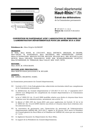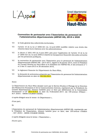 Compte tenu de la prochaine arrivée à échéance, le 31 décembre 2017, de la convention de partenariat entre le Département du Haut-Rhin et l’Association du personnel de l’administration départementale (ASPAD 68), il vous est proposé de conclure une nouvelle convention entre les deux parties pour les années 2018 à 2020 et d’autoriser la Présidente du Conseil départemental à la signer.
