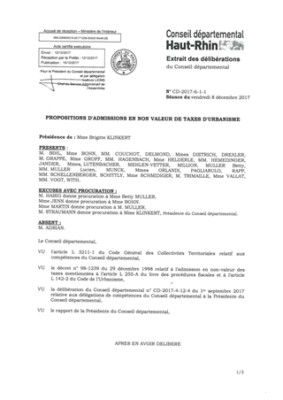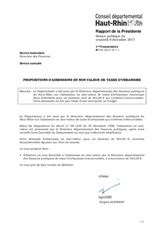 Le Département a été saisi par le Directeur départemental des finances publiques du Haut-Rhin sur l’admission en non-valeur de taxes d’urbanisme concernant deux redevables pour un montant total de 462,00 € qui s’avèrent irrécouvrables. Cette admission ne fait pas l’objet d’une inscription au budget.
