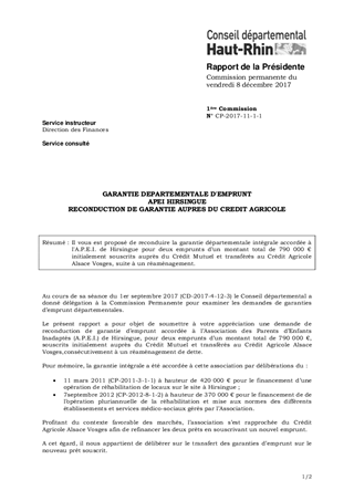 Il vous est proposé de reconduire la garantie départementale intégrale accordée à l'A.P.E.I. de Hirsingue pour deux emprunts d’un montant total de 790 000 € initialement souscrits auprès du Crédit Mutuel et transférés au Crédit Agricole Alsace Vosges, suite à un réaménagement.