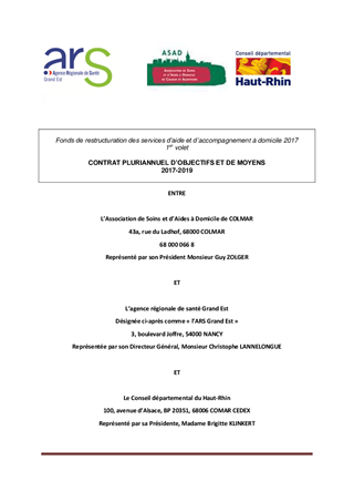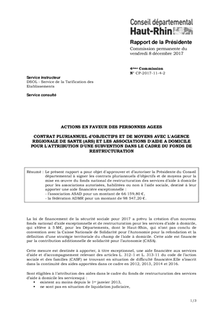 ACTIONS EN FAVEUR DES PERSONNES AGEESCONTRAT PLURIANNUEL d’OBJECTIFS ET DE MOYENS AVEC L'AGENCE REGIONALE DE SANTE (ARS) ET LES ASSOCIATIONS D'AIDE A DOMICILE POUR L'ATTRIBUTION D'UNE SUBVENTION DANS LE CADRE DU FONDS DE RESTRUCTURATION
